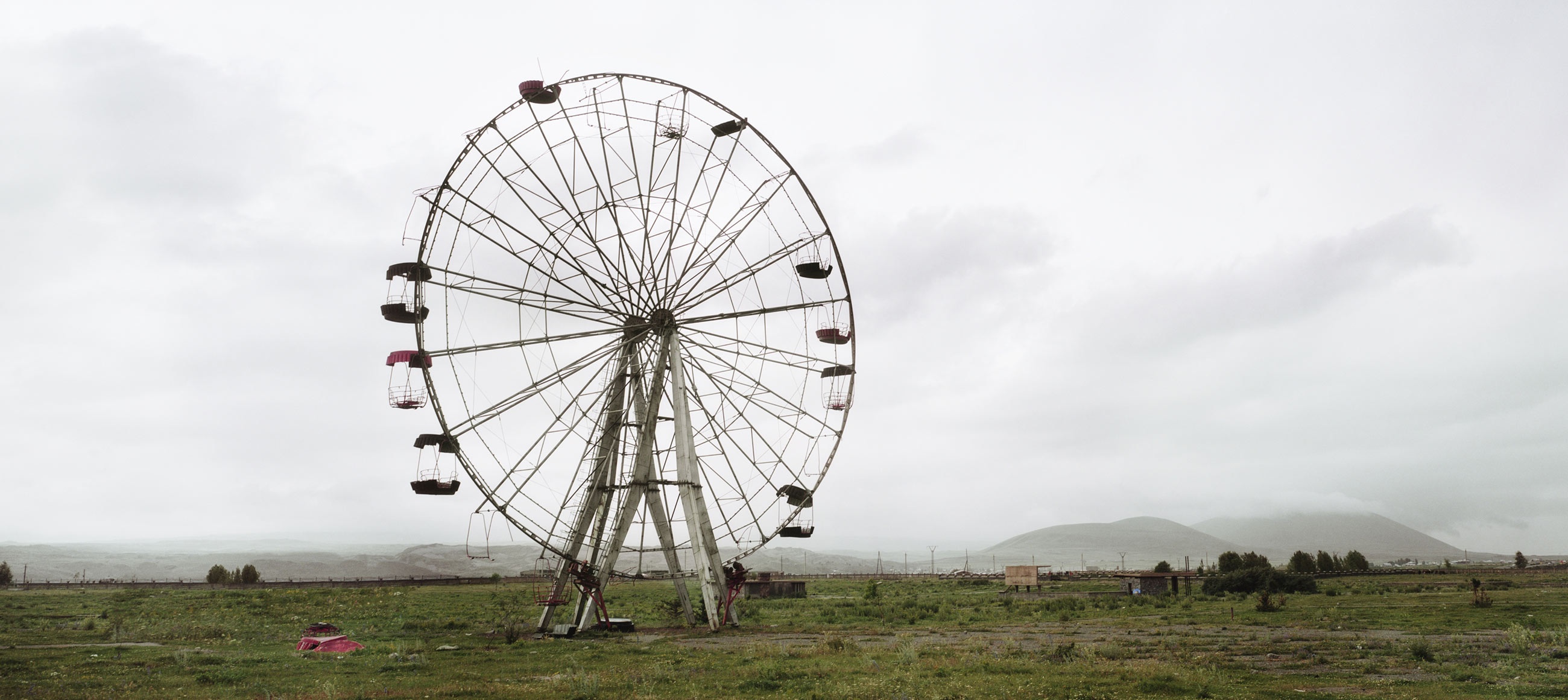 In the book, Wenders captures forty-four places that are melancholy and silent, yet charged with possibility. Time capsules, as he calls them. Number 9 and 10 are of a ferris wheel in Armenia from 2008. The first portrays a cloudy, calm landscape that is nostalgic and isolated. The second, from the opposite angle is sinister and exposed.  Alongside the fold-out photograph is a brief passage: